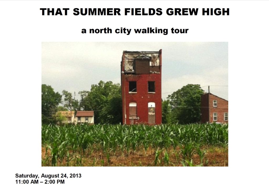 That Summer Fields Grew High provided a guided urban drift through St. Louis’ near north side neighborhoods of Old North St. Louis, St. Louis Place and Carr Square Village. These are areas where over half of the buildings ever built were erased, leaving wide open areas with conditions ranging from grassy lots to row-crop corn fields to the forest of the Pruitt-Igoe housing project site. This drift presented the opportunity for participants to craft a collective imaginary in which the abundance of open space was in fact realizing urban vitality, rather than representing undesirable loss. The dichotomy between “the city” and “vacant land” misses several points in between where other conditions exist or are possible.